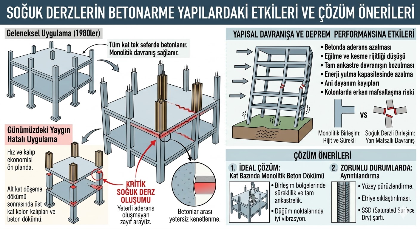 Kolon–döşeme birleşimlerinde oluşan soğuk derzler, betonarme yapıların deprem performansını olumsuz etkileyebilecek potansiyel zayıflıklar yaratmaktadır. Kat bazında monolitik beton dökümü, mühendislik açısından en güvenli yaklaşım olmaya devam etmektedir. Pratik zorunluluklar nedeniyle bu mümkün olmadığında ise, soğuk derzlerin bilinçli şekilde planlanması ve birleşim bölgelerinin özel olarak detaylandırılması hayati önem taşımaktadır.